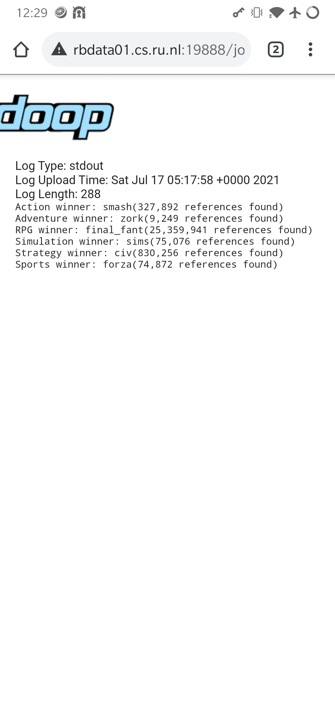 Initially, when I wanted to scale up from a single WARC file, I chose all the files (the whole folder: 610 of them). A single job (game) took ~13.6 hours. Extrapolating this for the full task, would mean running it for ~25 days straight, longer than the vacations. So, instead, I opted to 1/3 (~260 Warc files) of them using the following file-mathcing pattern to give to the Hadoop API. This brought the expected run-time to little over 6 days.